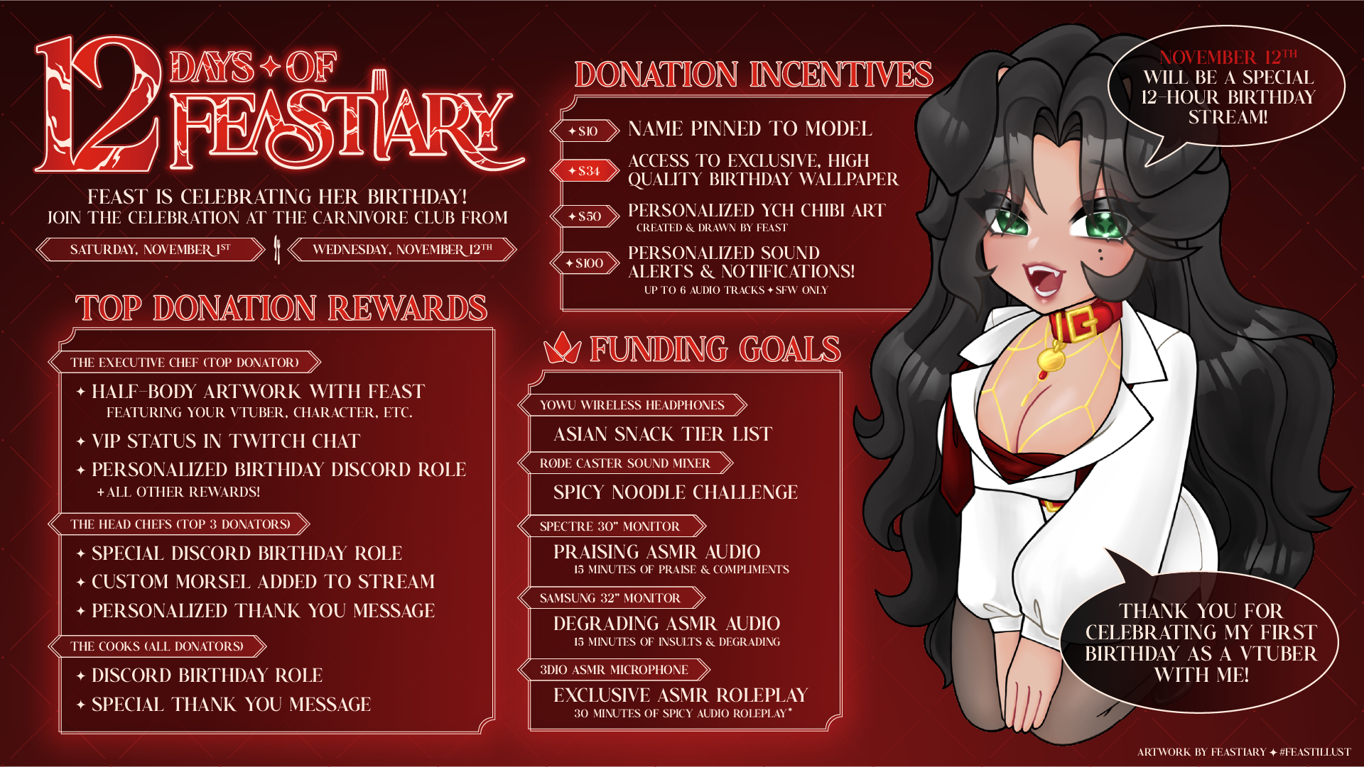 The Carnivore Club is celebrating 12 days of Feast! Join us from November 1st to November 12th for our very first Donothon! There will be games, guests & so much more, all concluding on Wednesday, November 12th with a special 12 hour stream extravaganza!Check out all of our various donation goals, incentives & rewards! If you are interested in supporting, feel free to donate below!